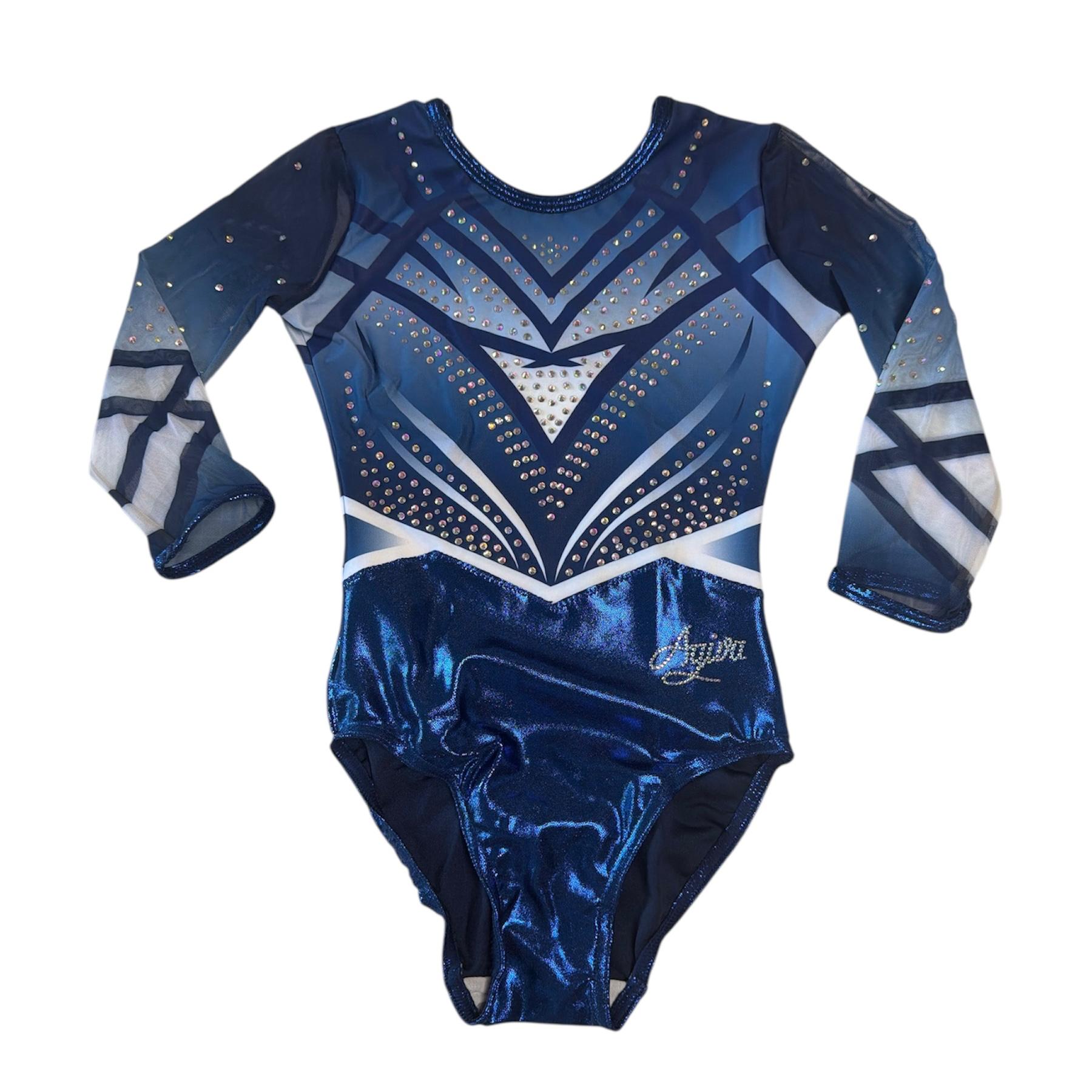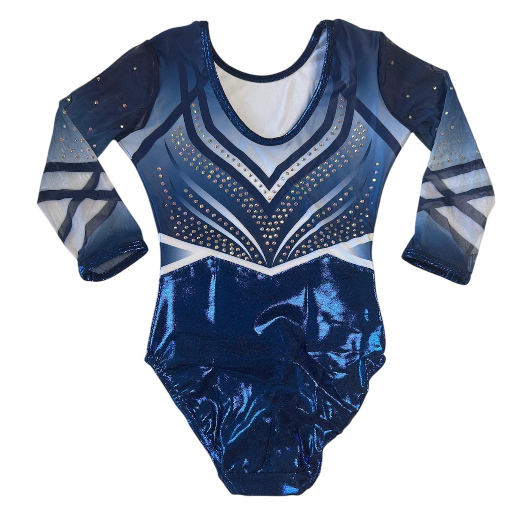 3/4 Arm-Turnanzug in Metallic-Blau mit weißem Farbverlauf und Strasssteinen – elegant und leistungsstark.