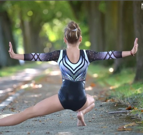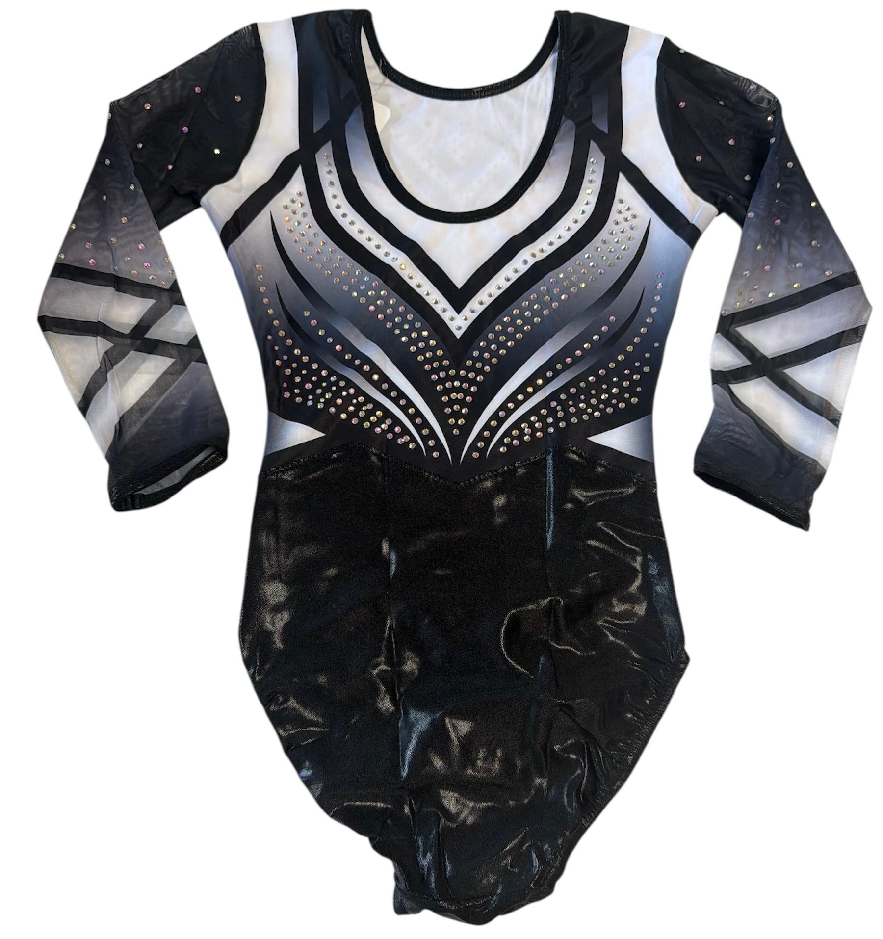 Schwarzer Langarm-Turnanzug mit weißem Farbverlauf und Strasssteinen – elegant und leistungsstark.