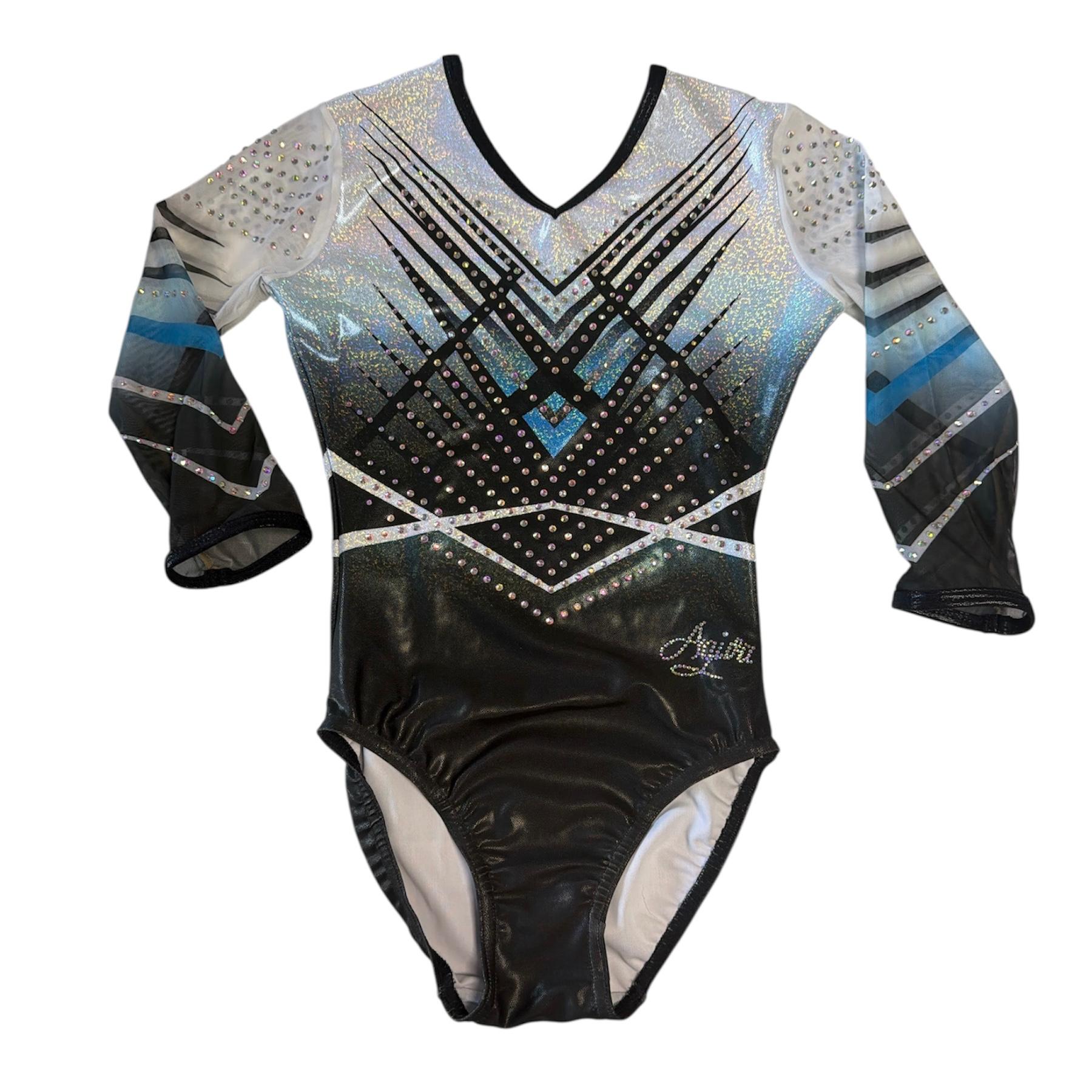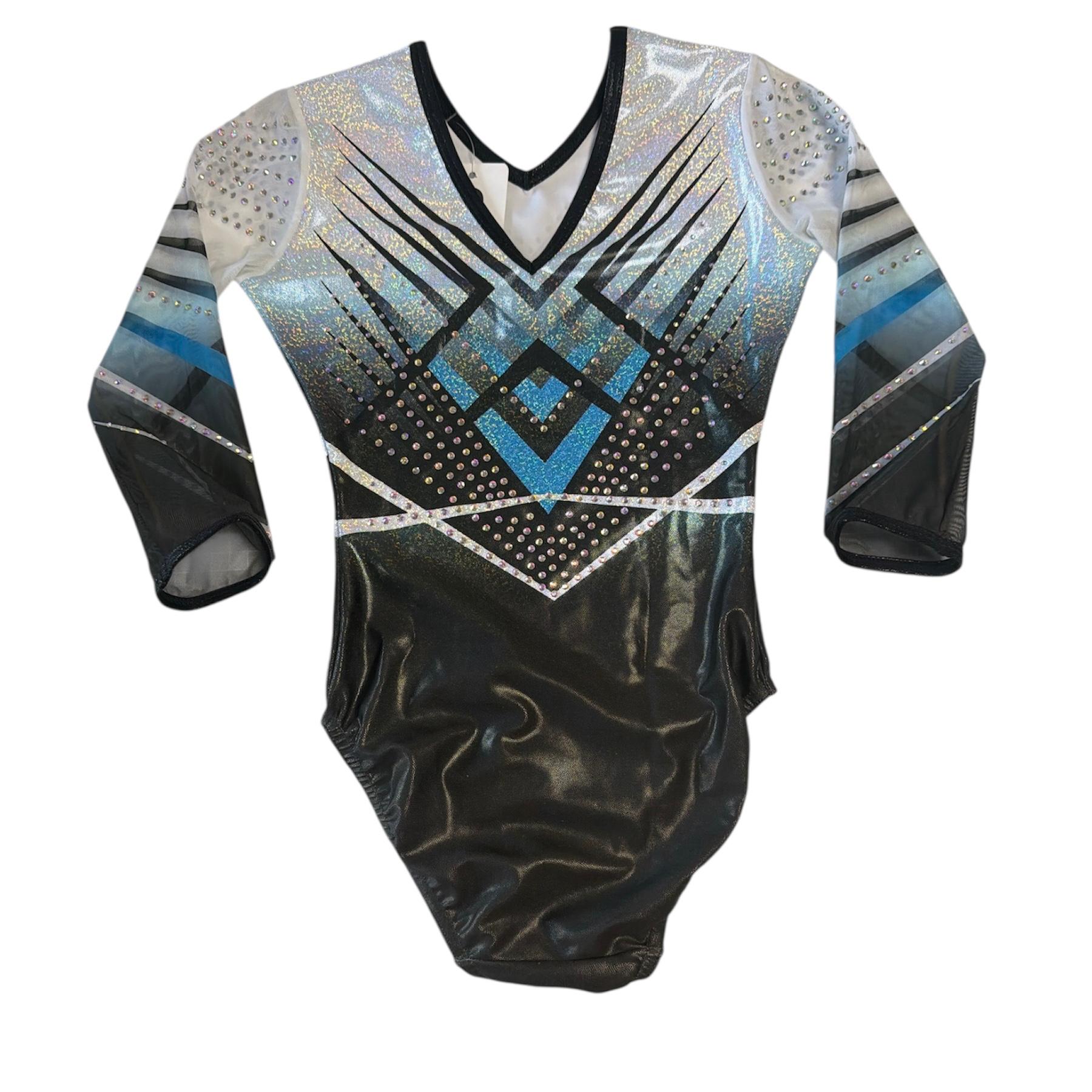Langarm-Turnanzug in Metallic schwarz, blau weißem Farbverlauf und Strasssteinen – elegant und leistungsstark.
